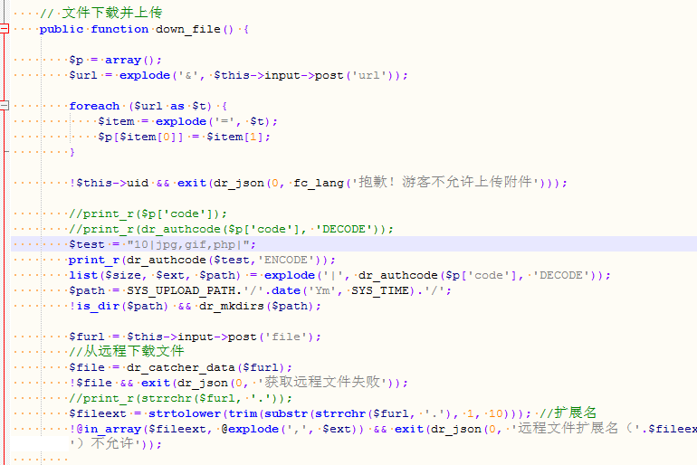 当我们上传附件时候,会把POST的数据先&分割再=分割,然后把code=XXX的XXX解码,文件后缀就是$ext,也就是XXX里面的内容,这个XXX是怎么来的呢?